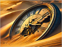 38. A desert with giant, ancient clock faces half-buried in the sand.