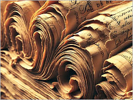 37. Old book pages: The yellowed, textured pages of a vintage book with visible ink and wear.