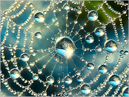 36. Water droplets: A close-up of water droplets on a spiderweb.