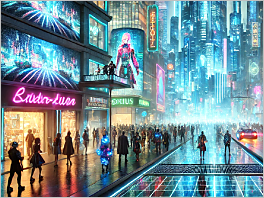 20. A futuristic metropolis with holographic advertisements and robotic street performers.