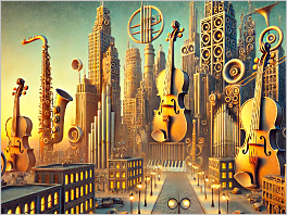 19. A cityscape where the buildings are made of musical instruments.