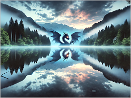 18. A serene lake where the reflection shows a dragon instead of the actual landscape.