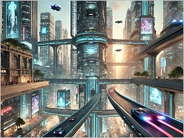 17. A city where buildings are connected by sky bridges and flying cars zoom by.