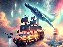 95. A floating market in the sky where merchant ships sail through clouds, their sails made of aurora borealis lights, selling constellation fragments and bottled rainbows, with sky whales gently gliding between the vessels