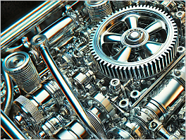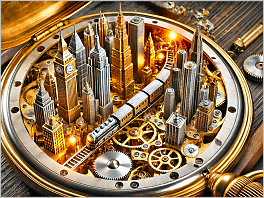 94. A miniature city built inside an antique pocket watch, with tiny trains running along the gears, microscopic skyscrapers between the watch hands, and mechanical birds flying between buildings