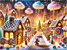 93. A candy village during a sugar snowstorm, with gingerbread buildings, lollipop trees, cotton candy clouds, and gummy bears using chocolate umbrellas