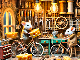 92. A bicycle repair shop run entirely by mice, with tiny tools and spare parts organized on matchbox shelves, cheese wheels as new tires, and string spools as work benches, all lit by firefly lanterns