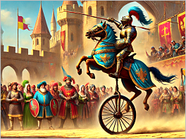 60. A medieval knight jousting on a unicycle instead of a horse, with a crowd of confused peasants watching.