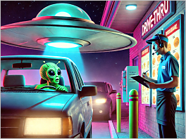 59. A UFO landing in a fast-food drive-thru, and the alien is ordering a milkshake.