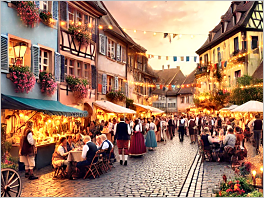 58. A European village during a festival, with cobblestone streets and festive decorations.