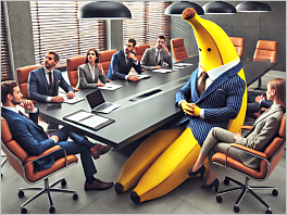 57. A business meeting where one of the attendees is a giant banana in a suit, casually taking notes.